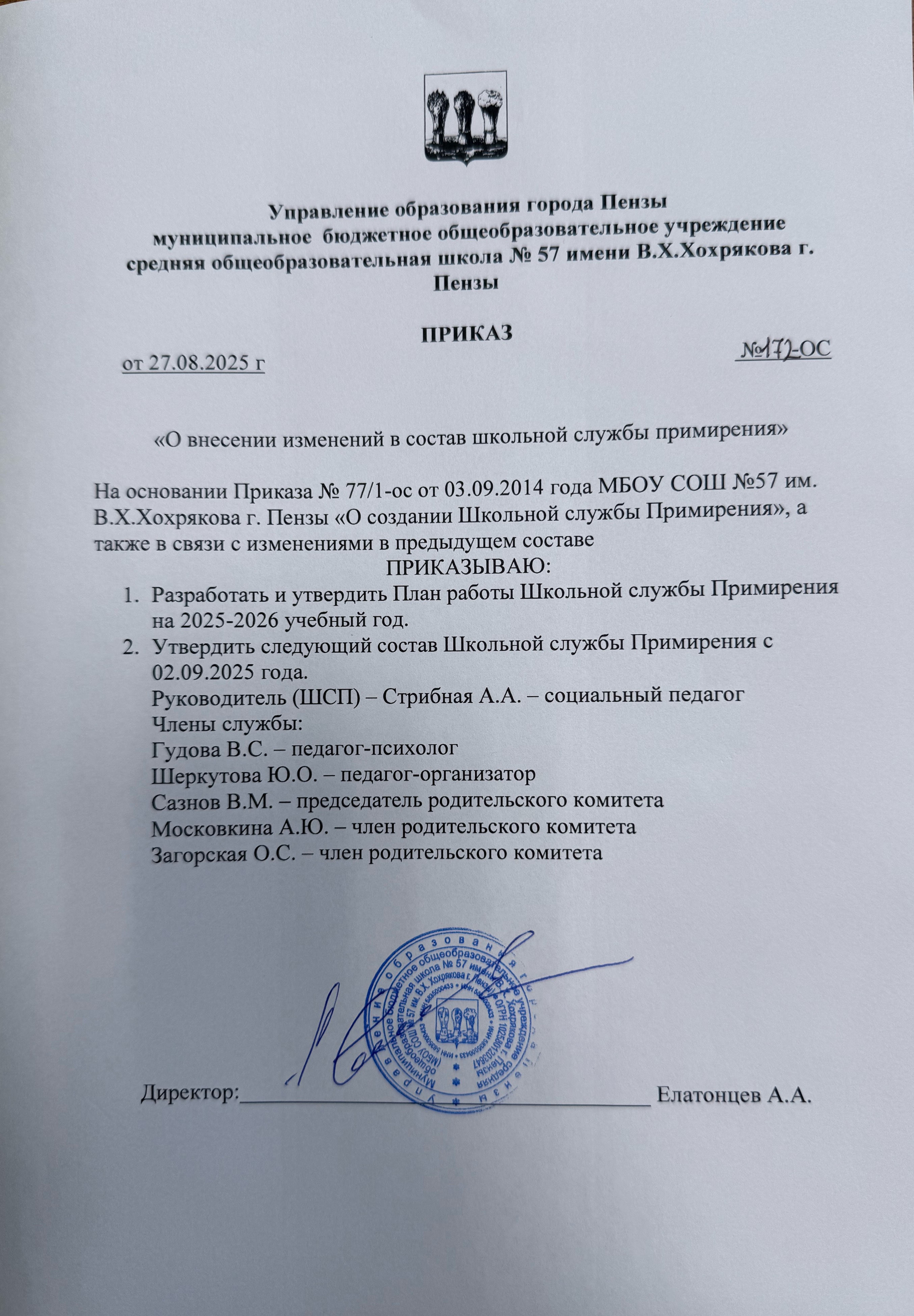 Приказ о внесении изменений в состав школьной службы примирения